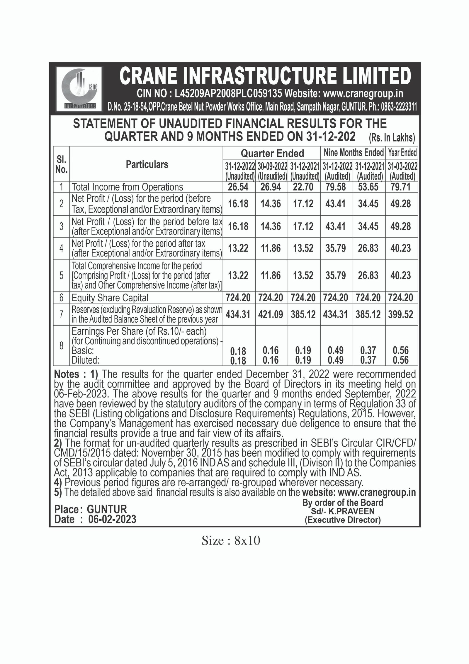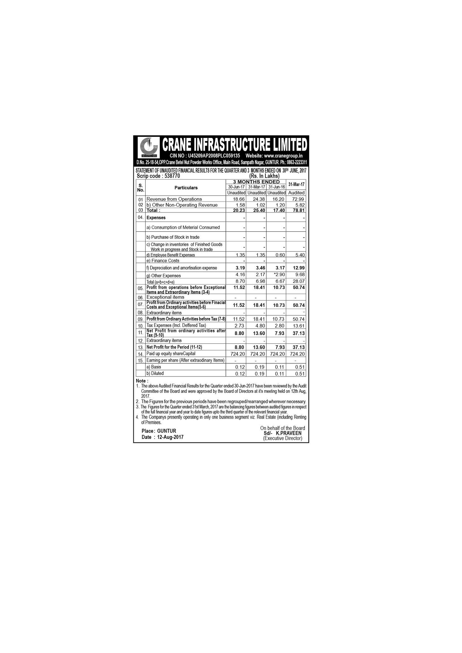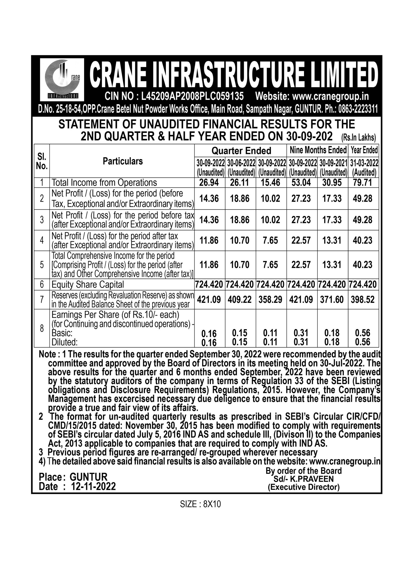 Crane Infrastructure ltd, Opp.CBNP Works, Sampath Nagar Main Road, Guntur-522004, Andhra Pradesh,India.